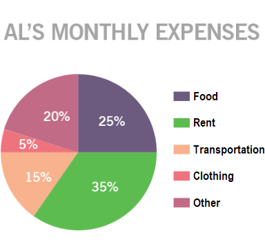 This pie chart shows Al’s monthly expenses. If Al spent $210 on transportation in one month, how much did he spend on food in that month?